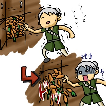 取り出すのも大変そうな蔵から万均を作る為に人参をどうしても取り出さないといけない。